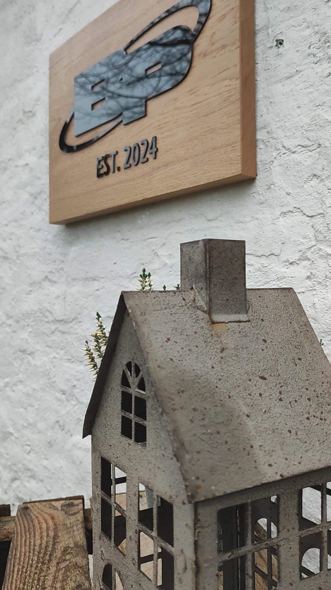 Eichen-Haustürschild mit Firmenlogo in schwarzem Acryl